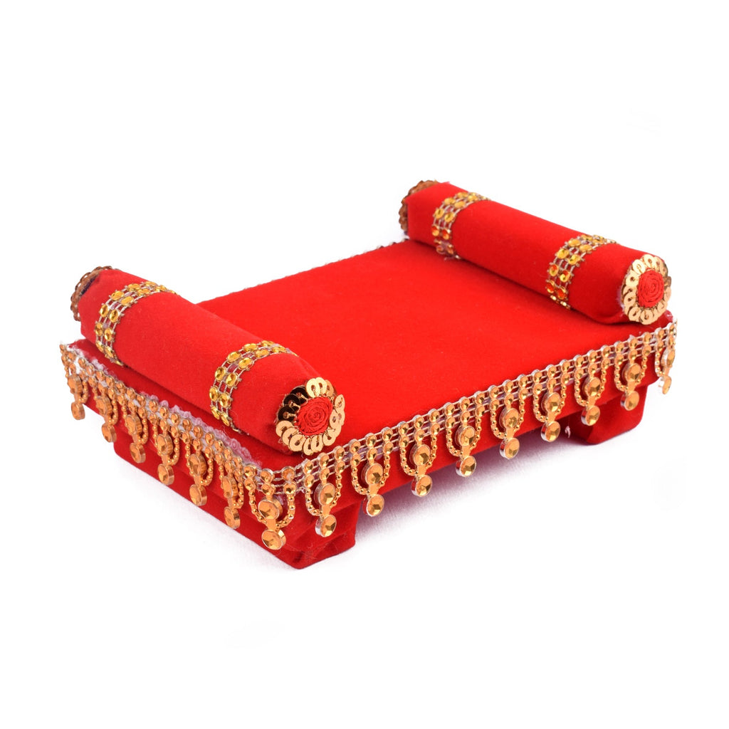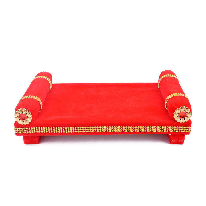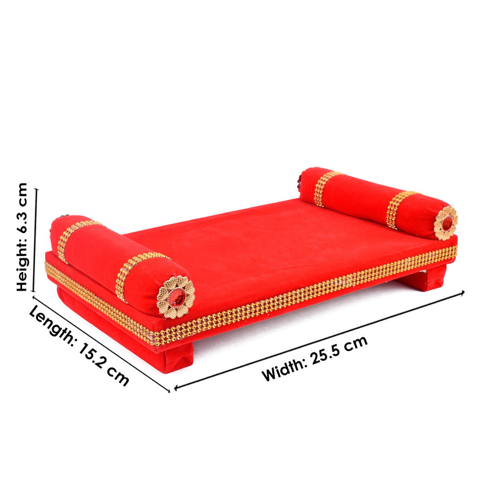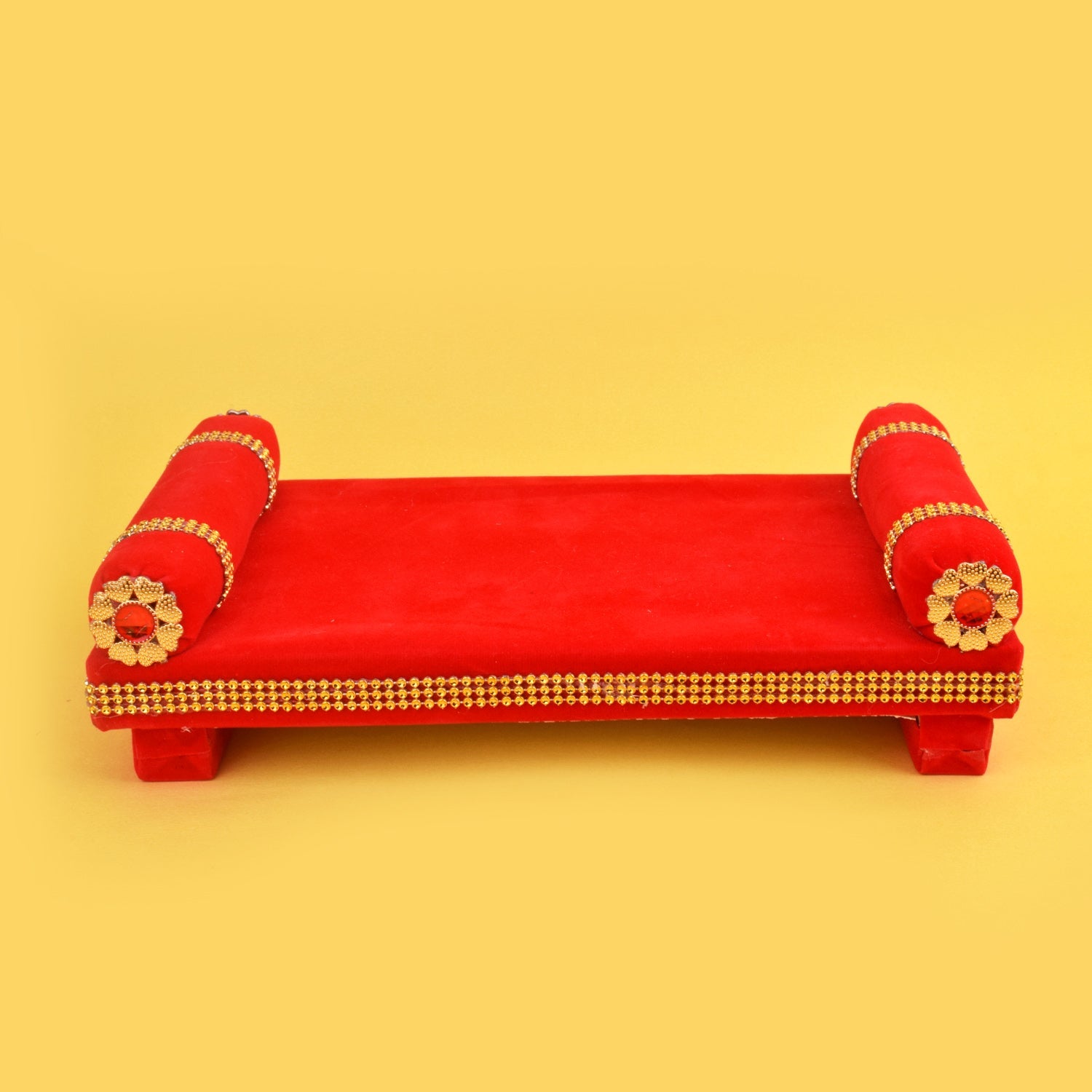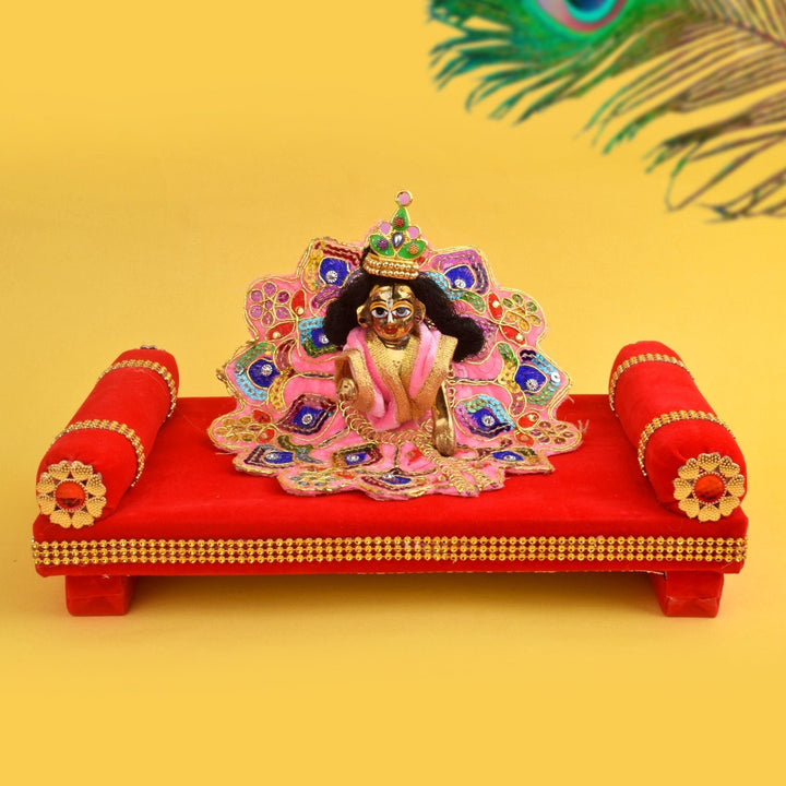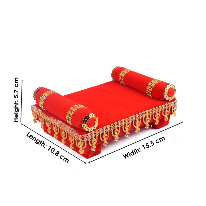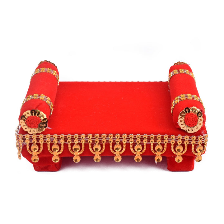 The plush surface offers comfort for the idol while enhancing the spiritual ambiance with its vibrant color and regal appeal. Whether for Janmashtami, daily pooja, or temple decor, this singhasan adds a sacred elegance and becomes the heart of your altar.