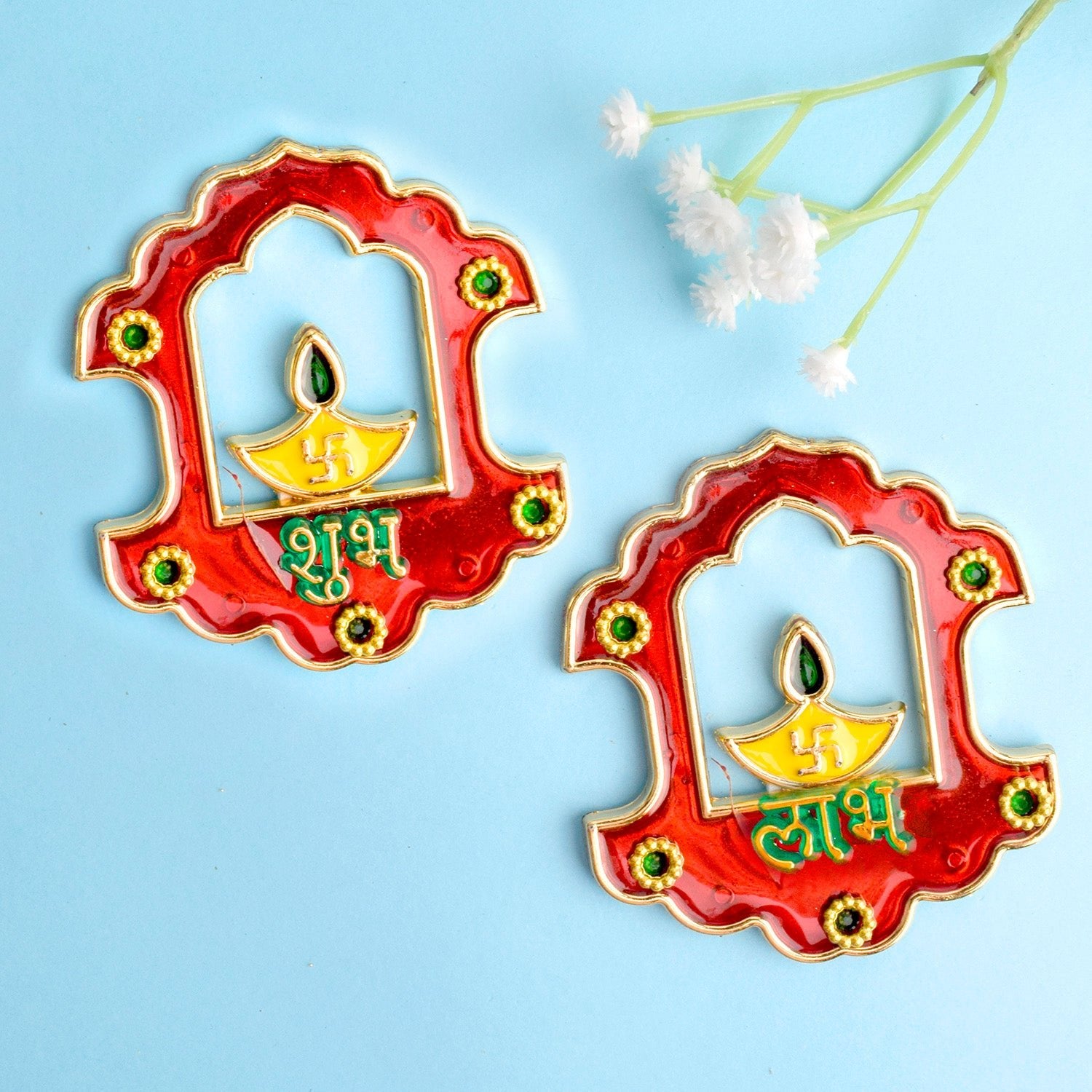 Shubh Labh Leaf With Swastik Wooden StickerPackage Contains: 1 Pair of Diyas Sticker