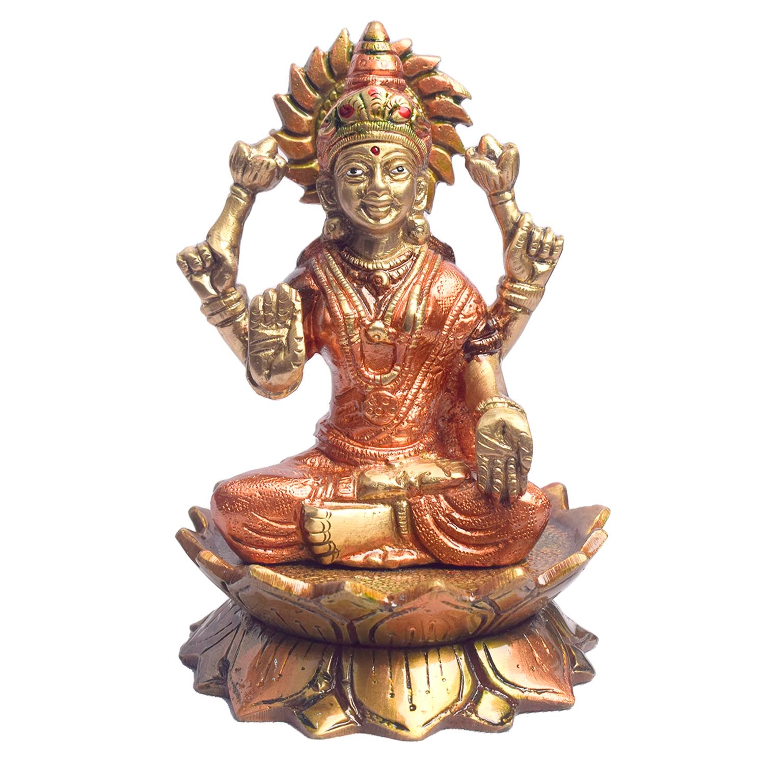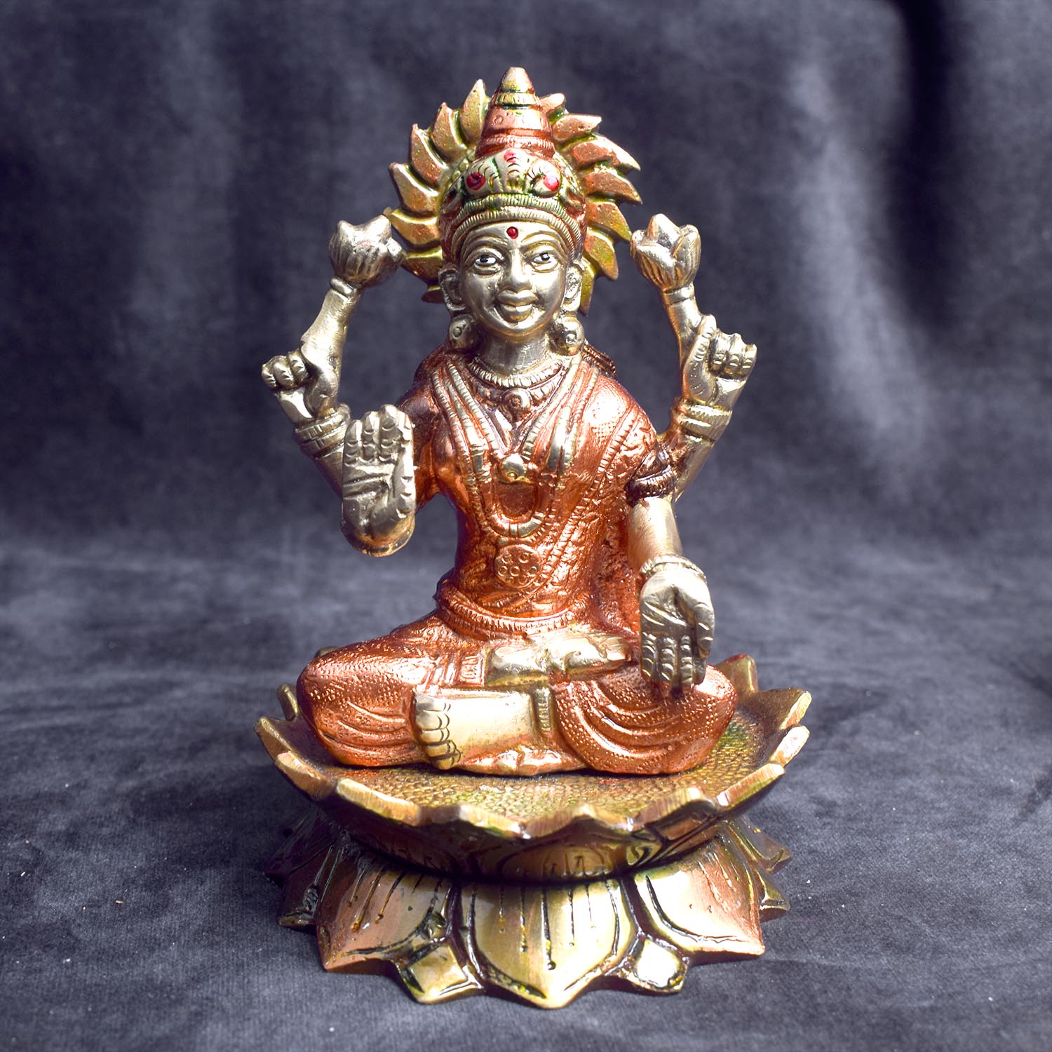 • Lakshmi, the Goddess of wealth, prosperity, and fortune, is typically depicted with her graceful and serene posture, holding lotus flowers and gold coins, symbolizing abundance and blessings.
