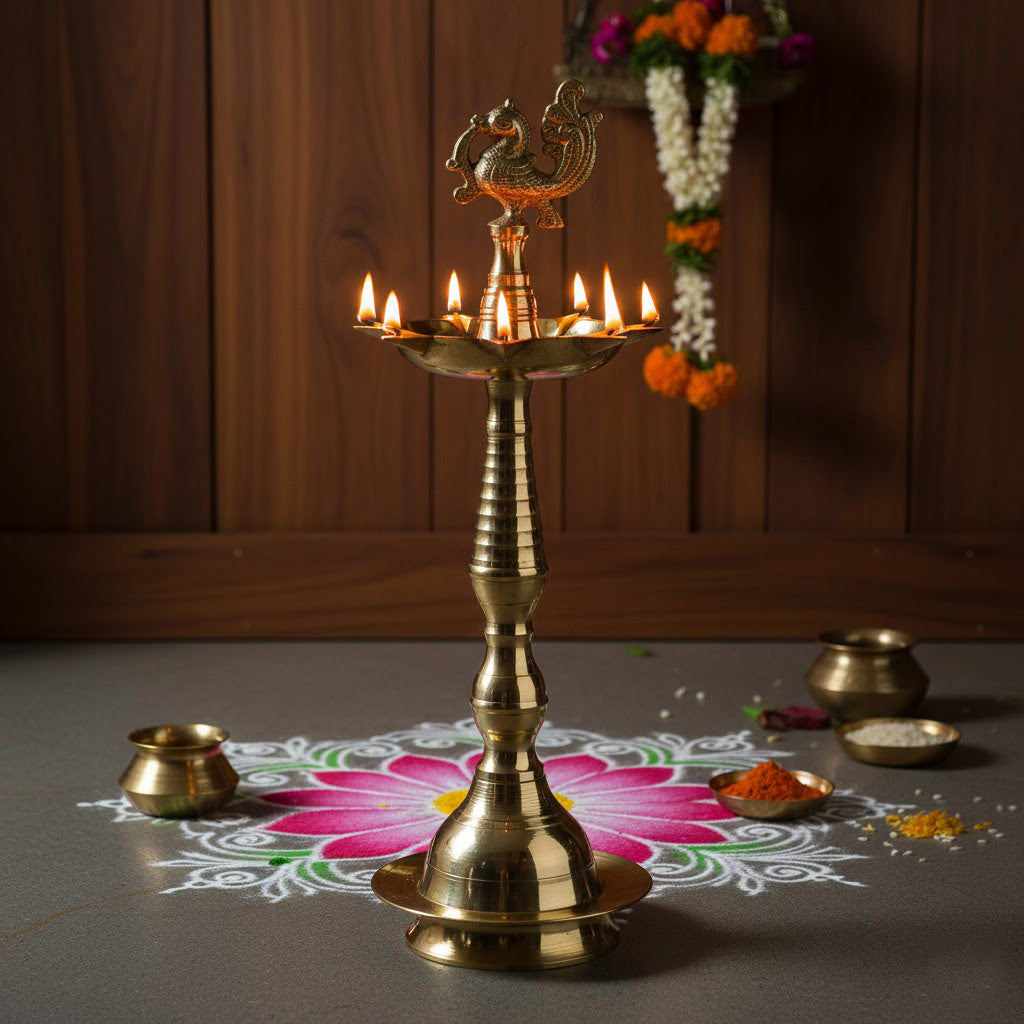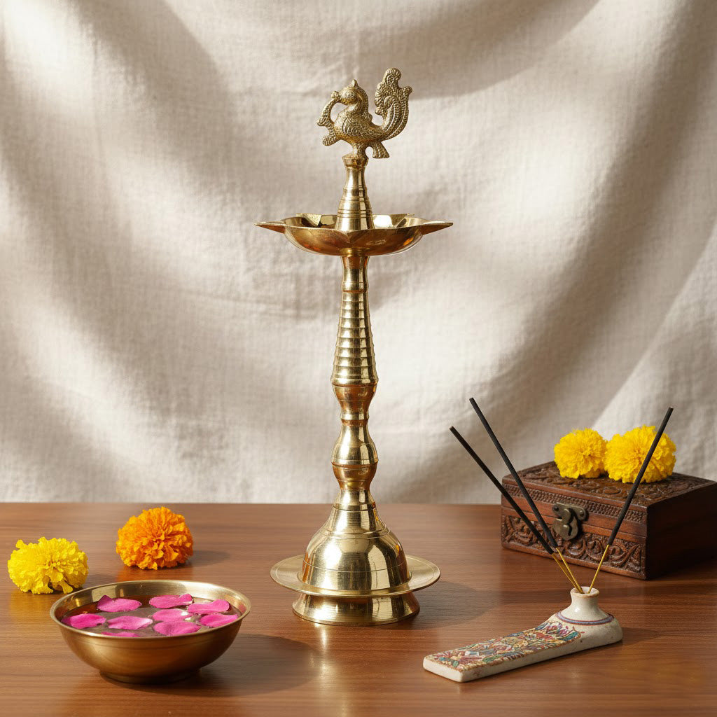 About Product: Enhance your pooja space with this Traditional 13 Inch Brass Peacock Kerala Diya, a symbol of devotion, prosperity, and divine light. Made from high-quality brass, this beautifully crafted Kerala-style oil lamp features an elegant peacock design that represents purity and positive energy. Rooted in South Indian tradition, the Kerala Diya is an essential part of daily pooja, temple rituals, and auspicious ceremonies. When lit, it is believed to remove negativity and invite peace and blessings into the home. The tall, sturdy structure ensures a steady flame, making it ideal for regular worship and festive occasions.