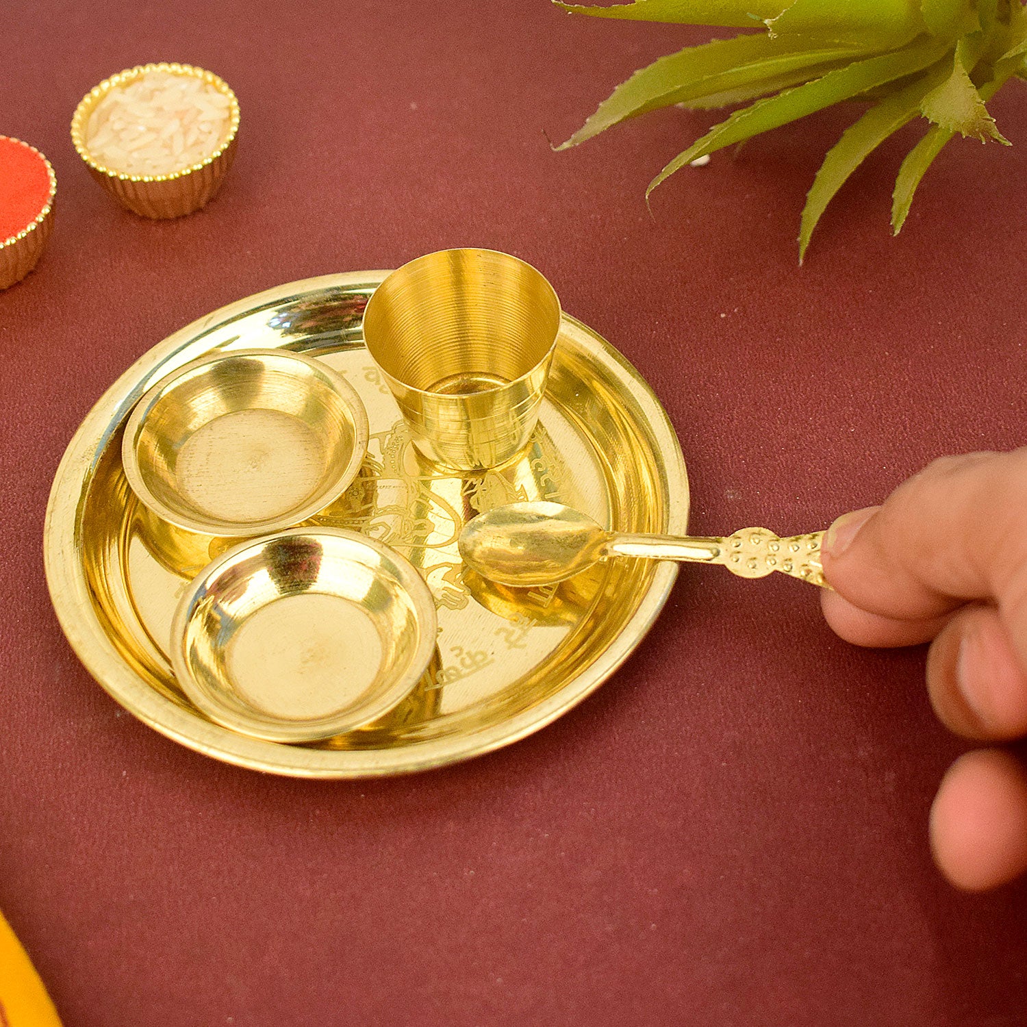 • Traditional and timeless, with diya, bell, incense holder, and roli chawal katori.