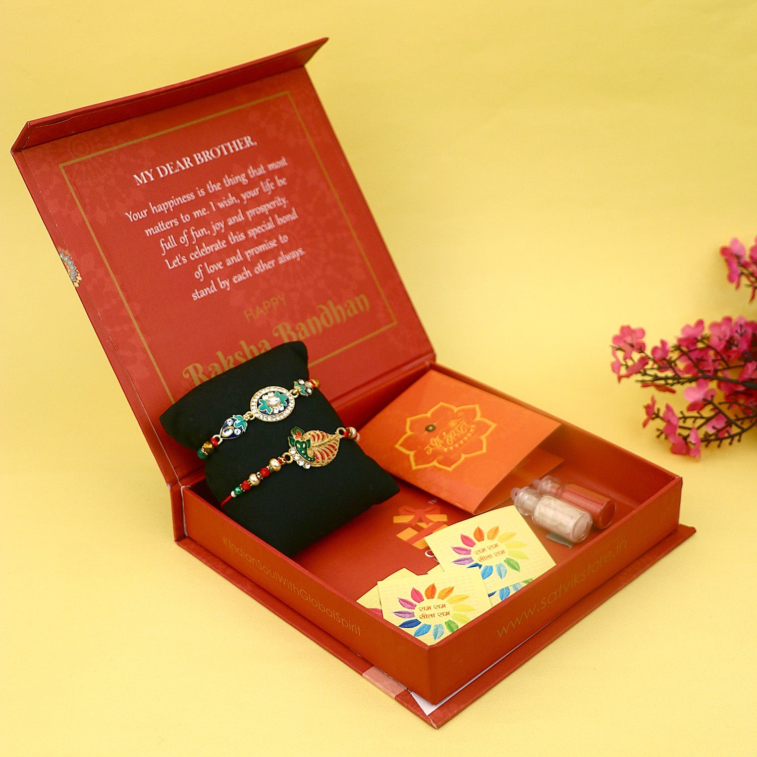 • Package: Set of 2 Bhaiya Rakhi, 1 Greeting card, 1 Roli Chawal Bottle, 1 Designer Gift Box