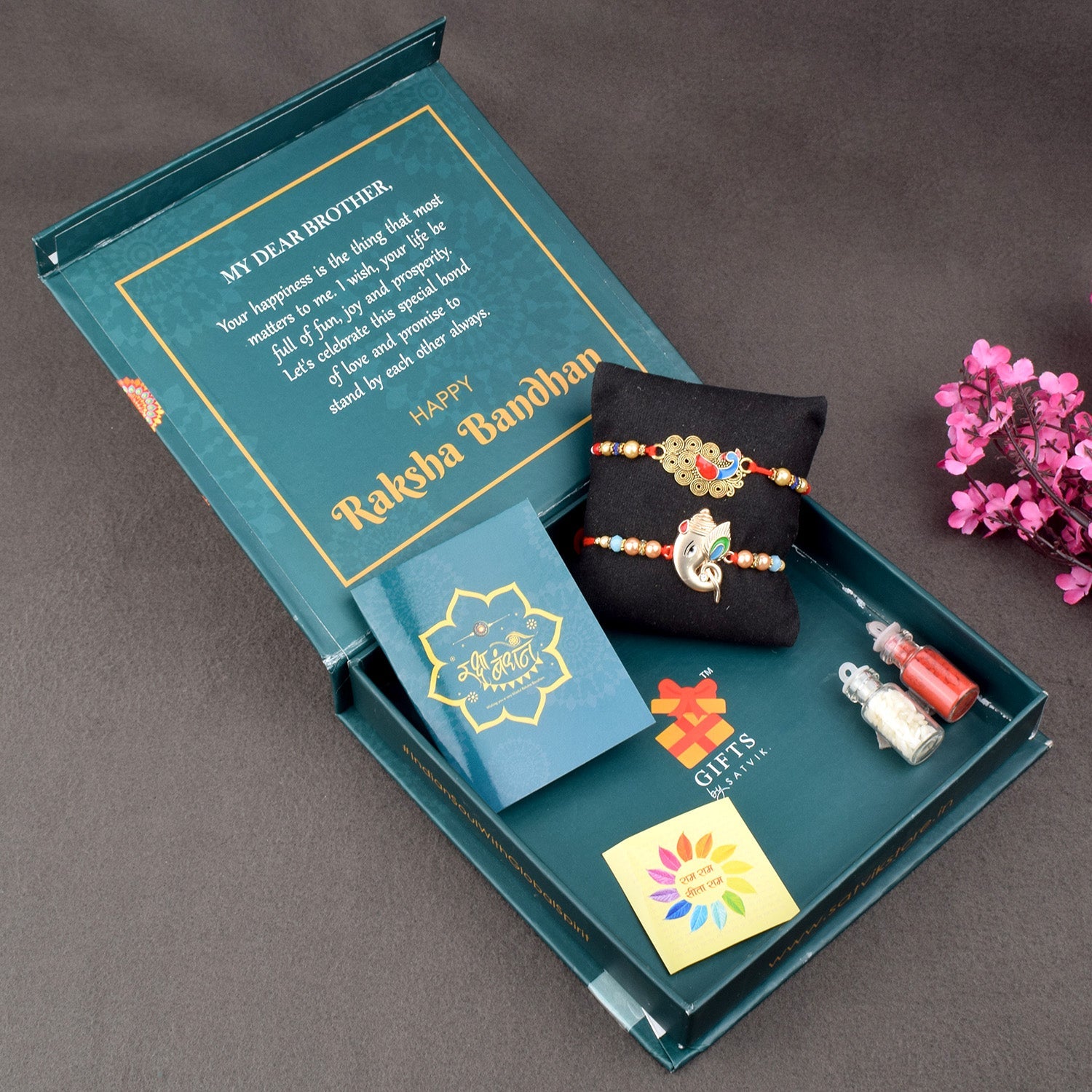 • Package: Set of 2 Bhaiya Rakhi, 1 Greeting card, 1 Roli Chawal Bottle, 1 Designer Gift Box