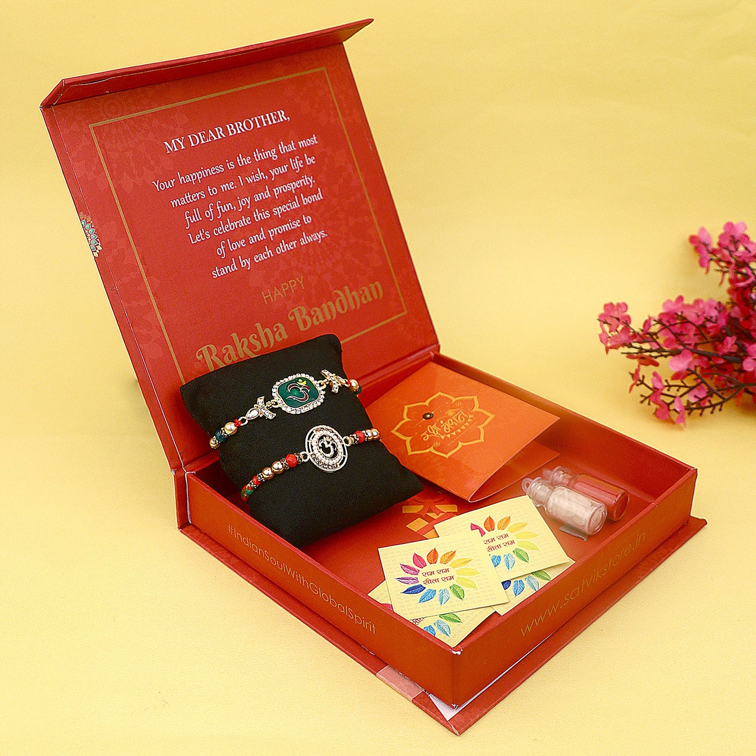 • Package: Set of 2 Bhaiya Rakhi, 1 Greeting card, 1 Roli Chawal Bottle, 1 Designer Gift Box