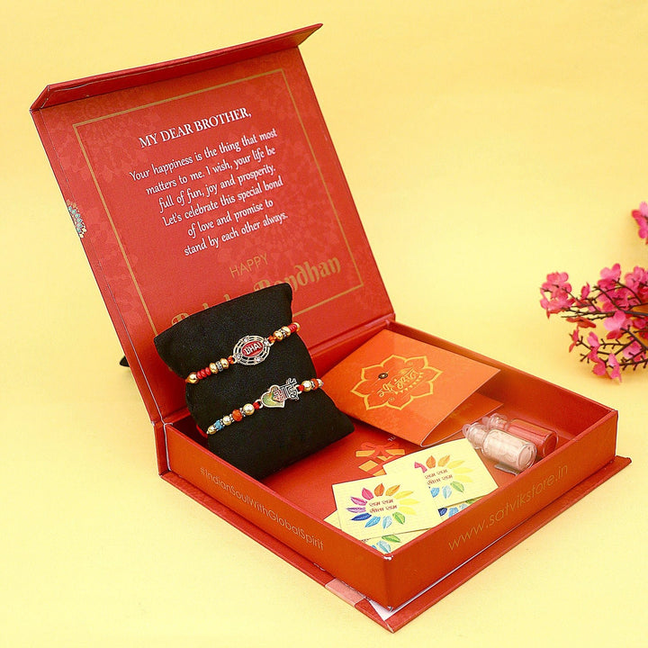 • Package: Set of 2 Bhaiya Rakhi, 1 Greeting card, 1 Roli Chawal Bottle, 1 Designer Gift Box