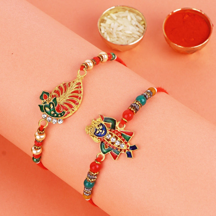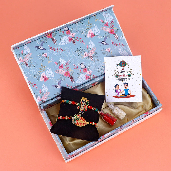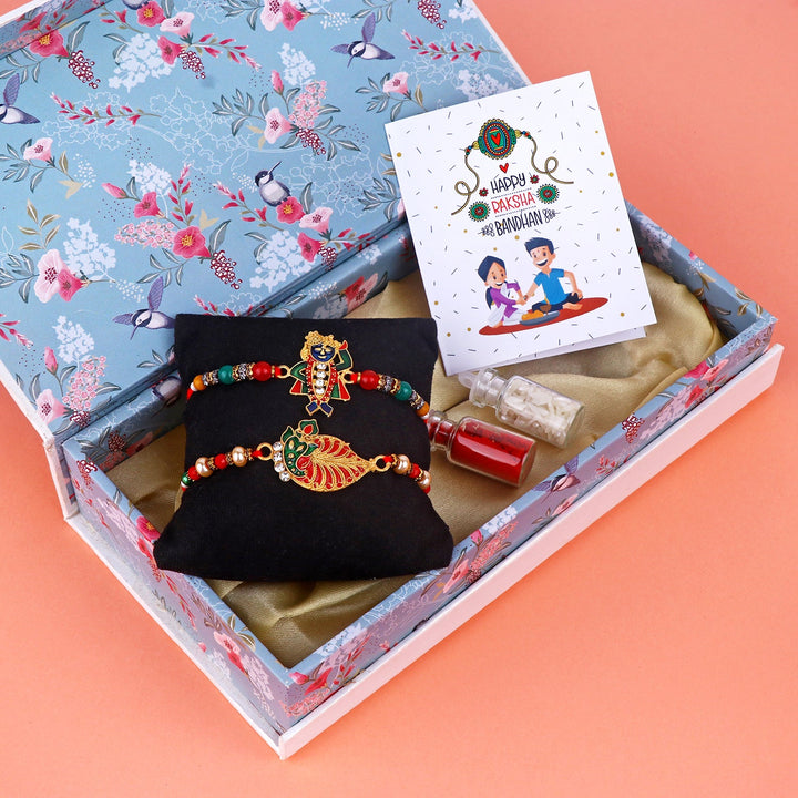 • Package: Set of 2 Bhaiya Rakhi, 1 Greeting card, 1 Roli Chawal Bottle, 1 Designer Gift Box