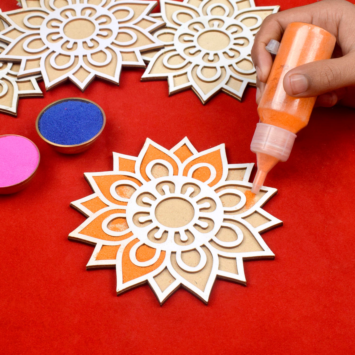 • Material & Size: Portable Rangoli crafted from MDF material not flexible like any other so that you can easily move even filled rangoli here and there. They are available in four exquisite designs, each measuring 6 inches.