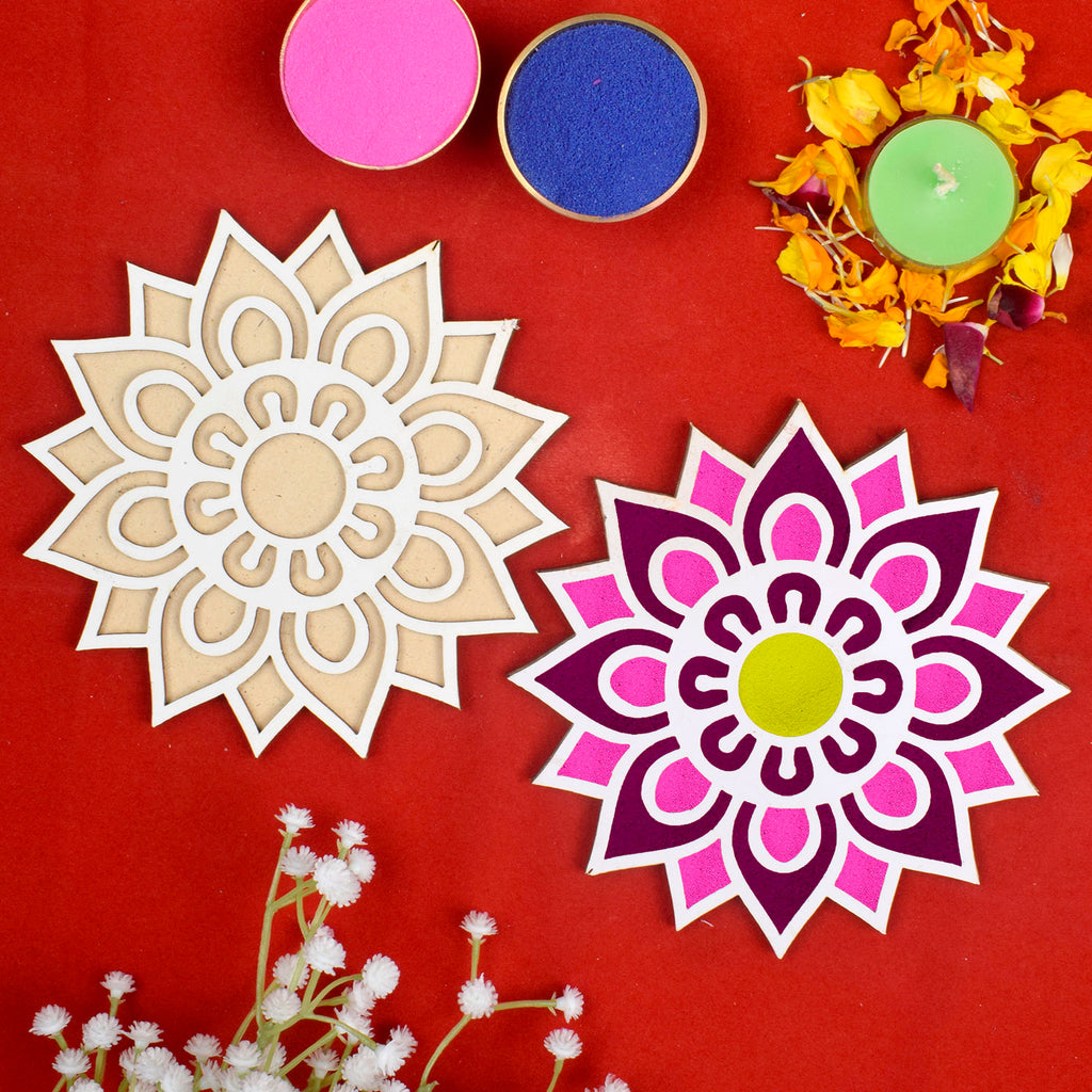 • Durable Materials: Crafted from wooden tools, the mat is built to last, ensuring you can use it for many Diwalis to come. Endless Design Possibilities: Explore an array of designs, from traditional kolam patterns to modern floral and border designs, with our versatile stencils.