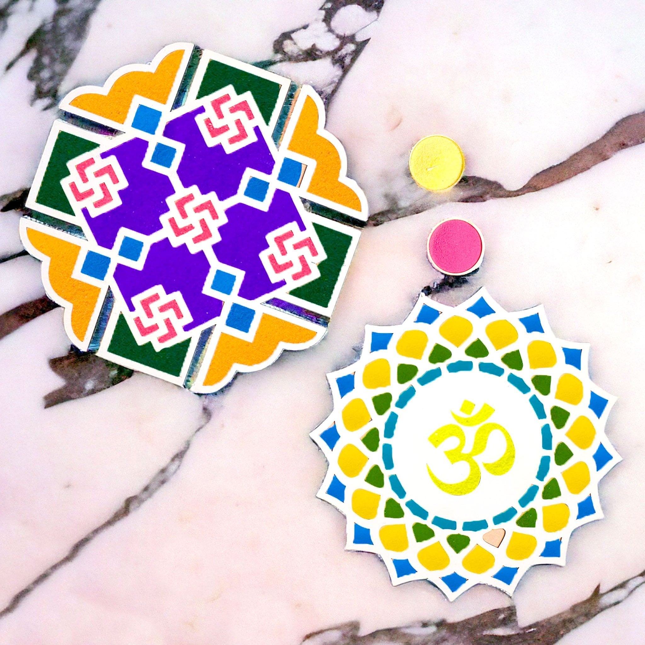 • Package Contain: Set of 2 Different Design Portable Rangoli Stencils with 5 rangoli pouches.