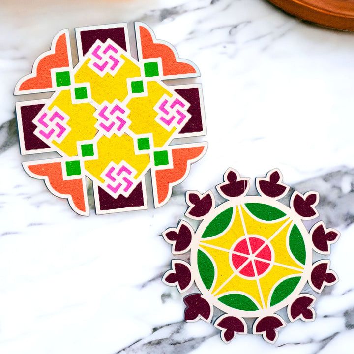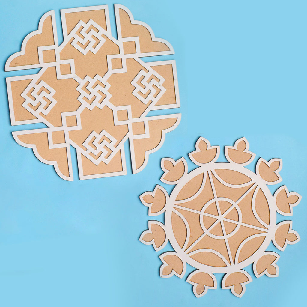 • Durable Materials: Crafted from wooden tools, the mat is built to last, ensuring you can use it for many Diwalis to come. Endless Design Possibilities: Explore an array of designs, from traditional kolam patterns to modern floral and border designs, with our versatile stencils.
