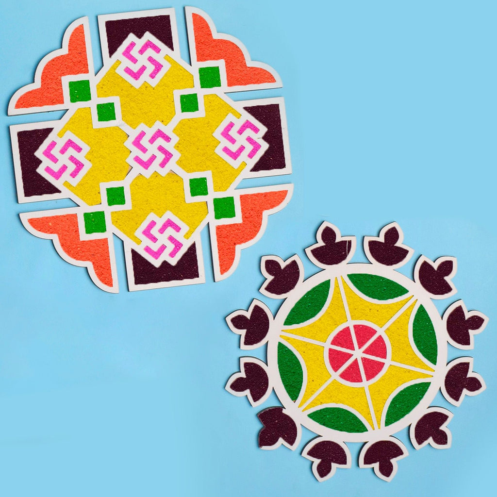 • Package Contain: Set of 2 Different Design Portable Rangoli Stencils with 5 rangoli pouches.