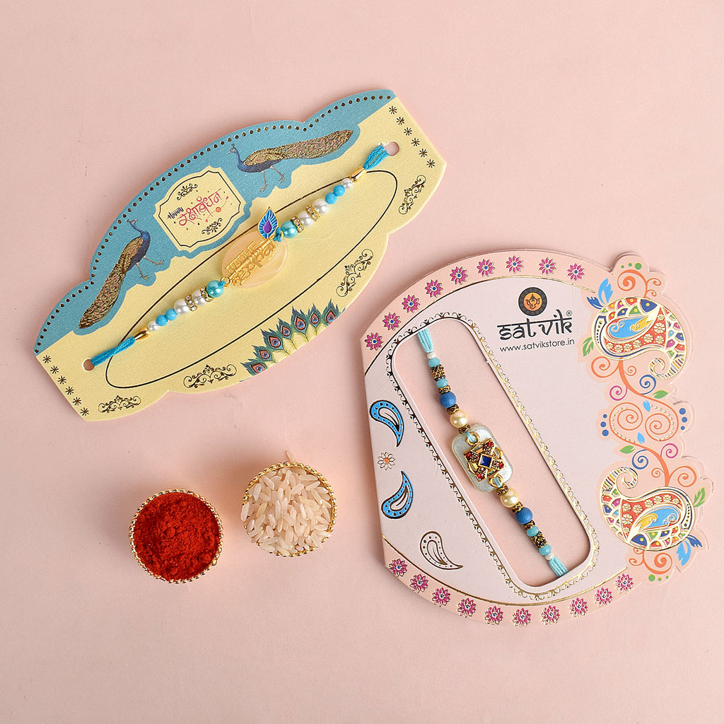 About Product: Strengthen the sacred bond of sibling love with this Set of Two Rakhis, beautifully designed for your beloved brothers. Each rakhi features traditional threadwork and intricate detailing, making them a perfect blend of spirituality and festivity.