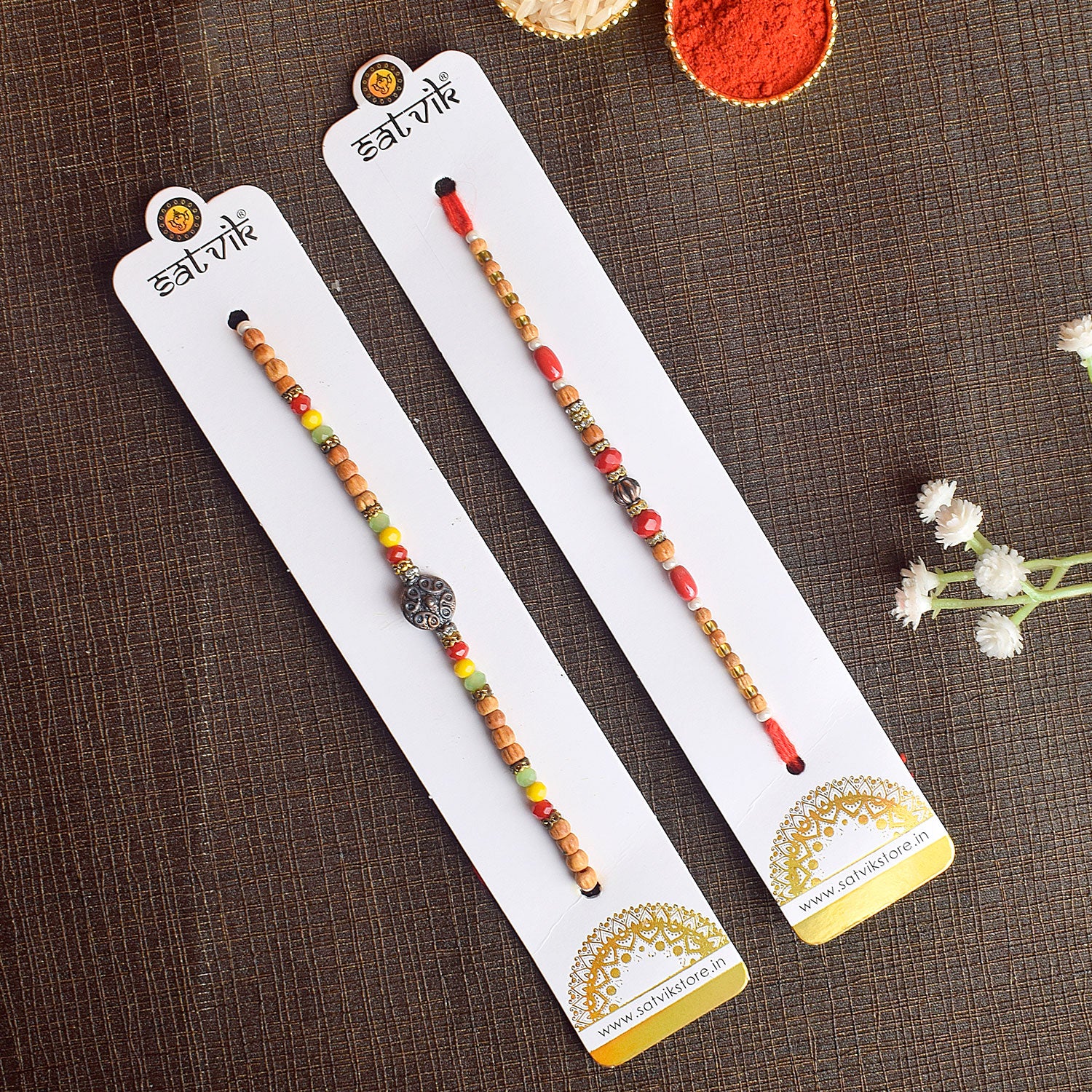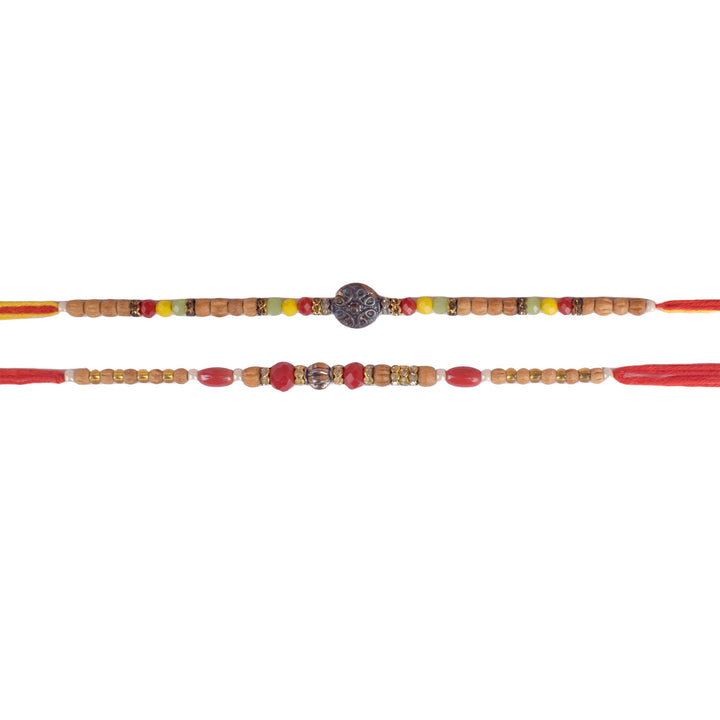 About Product: Strengthen the sacred bond of sibling love with this Set of Two Rakhis, beautifully designed for your beloved brothers. Each rakhi features traditional threadwork and intricate detailing, making them a perfect blend of spirituality and festivity.