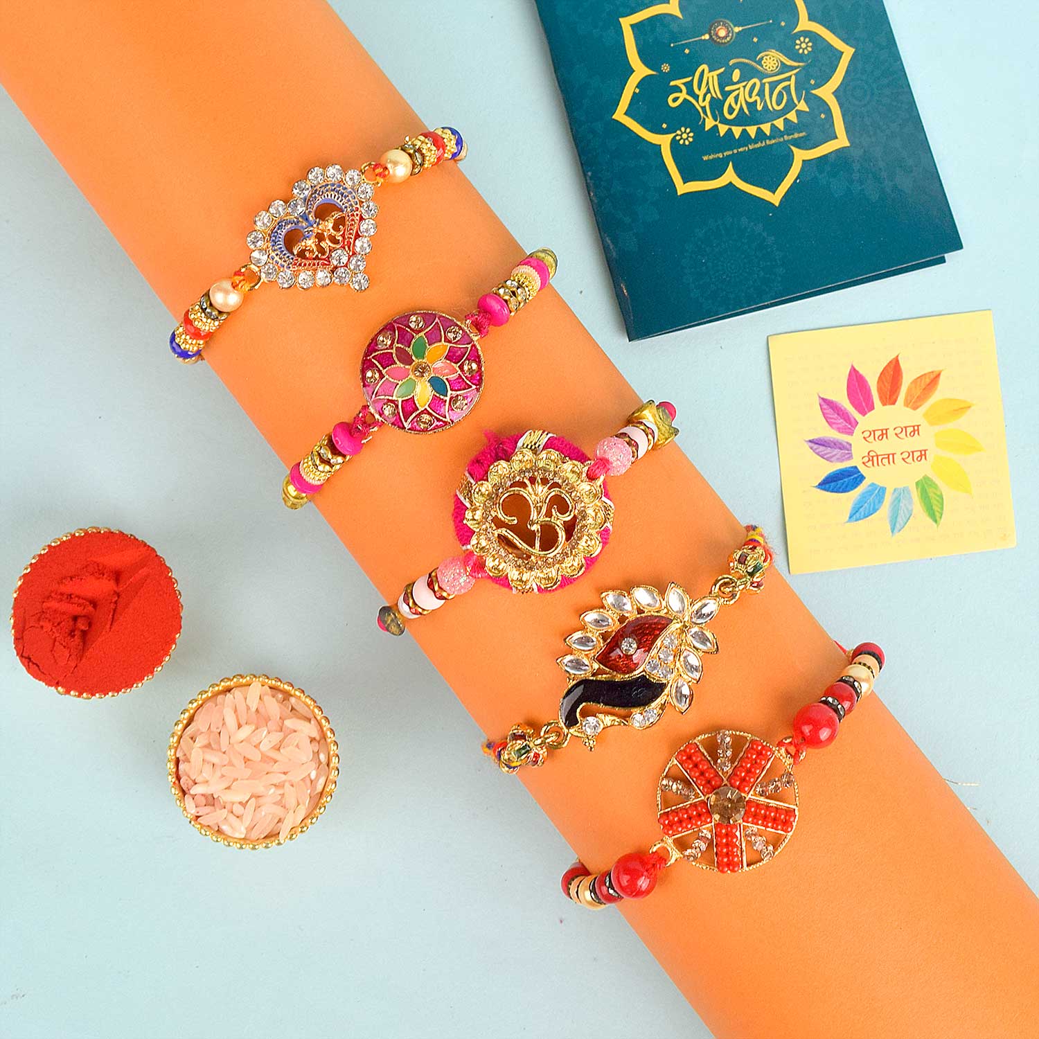 • Package: 5 Designer Rakhis (Traditional & Trendy Designs) Rakhi Roli Chawal Pack, Ram & Sita Blessings Stickers
