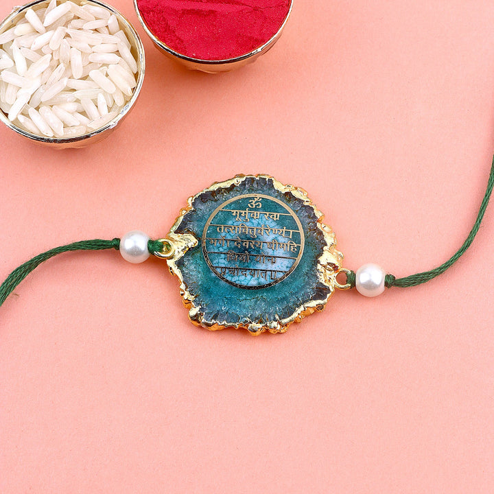 Artistry of Devotion: Graceful Agate Stone Rakhi with Gayatri Mantra