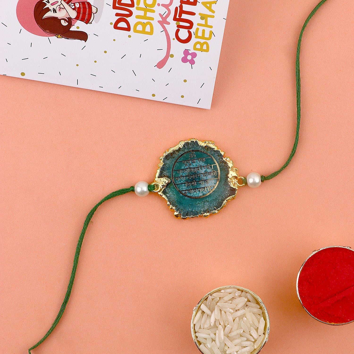 • Package: 1 Pc Agate Stone Gayatri Mantra Rakhi, Roli Akshat, Greeting Card