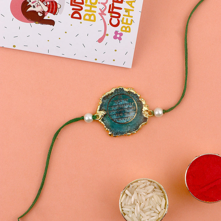 • About Product: The Agate Stone Gayatri Mantra Rakhi is meticulously crafted with utmost care and attention to detail. The centerpiece of the Rakhi is a stunning Agate stone, delicately embedded in the design. Surrounding the stone are sacred symbols and motifs that symbolize protection, strength, and spiritual growth.