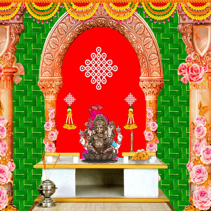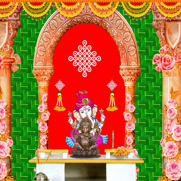 Ganesh Backdrop Cloth | Banana Leaf Print Backdrop | Pooja Decoration Cloth | Printed Ganesh Mandir Cloth | Temple Background Fabric | Decorative Cloth for Pooja | Ganpati Decoration Backdrop |