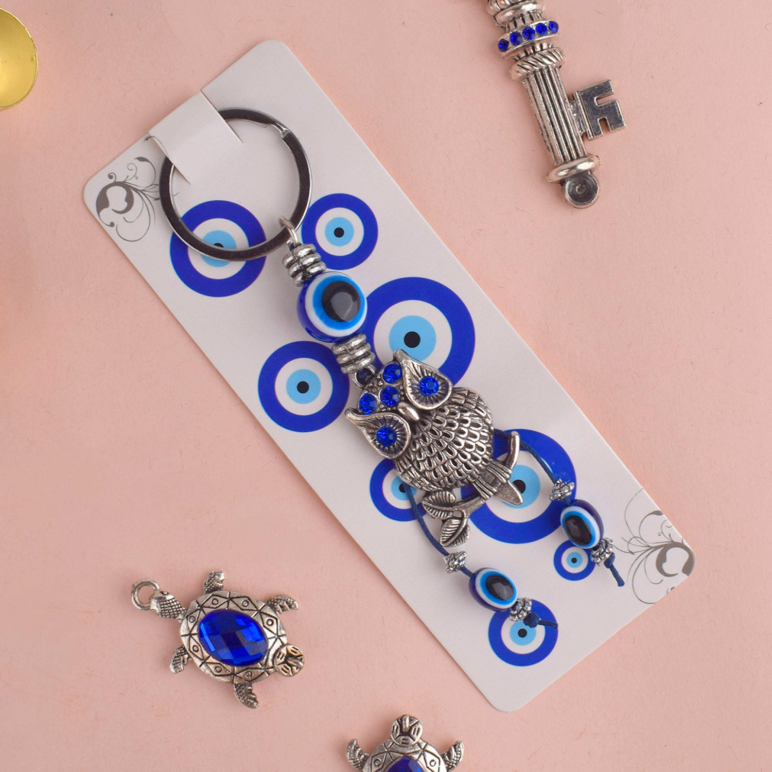 About Product: Enhance your key organization with the Blue Bead Silver Evil Eye Turtle Keychain for protection against negative energies. Perfect for car, bike, and room keys, this lightweight accessory makes an ideal gift for any occasion. Stylish, functional, and easy to carry.