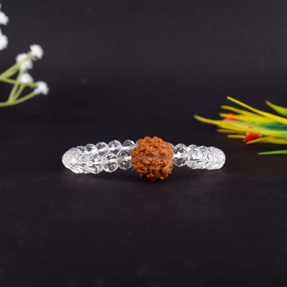 About Product: The 4 Mukhi Rudraksha Bracelet with Sphatik Beads is a sacred spiritual bracelet that represents Lord Brahma, the creator of the universe. The 4 Mukhi Rudraksha is known to enhance memory, knowledge, and communication skills, making it especially beneficial for students, teachers, and professionals.