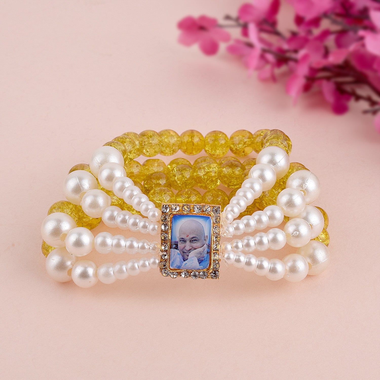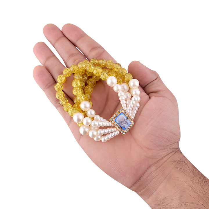 Crystal Yellow Beads Four Layer & White Pearl Bracelet with Jai Guruji Swaroop