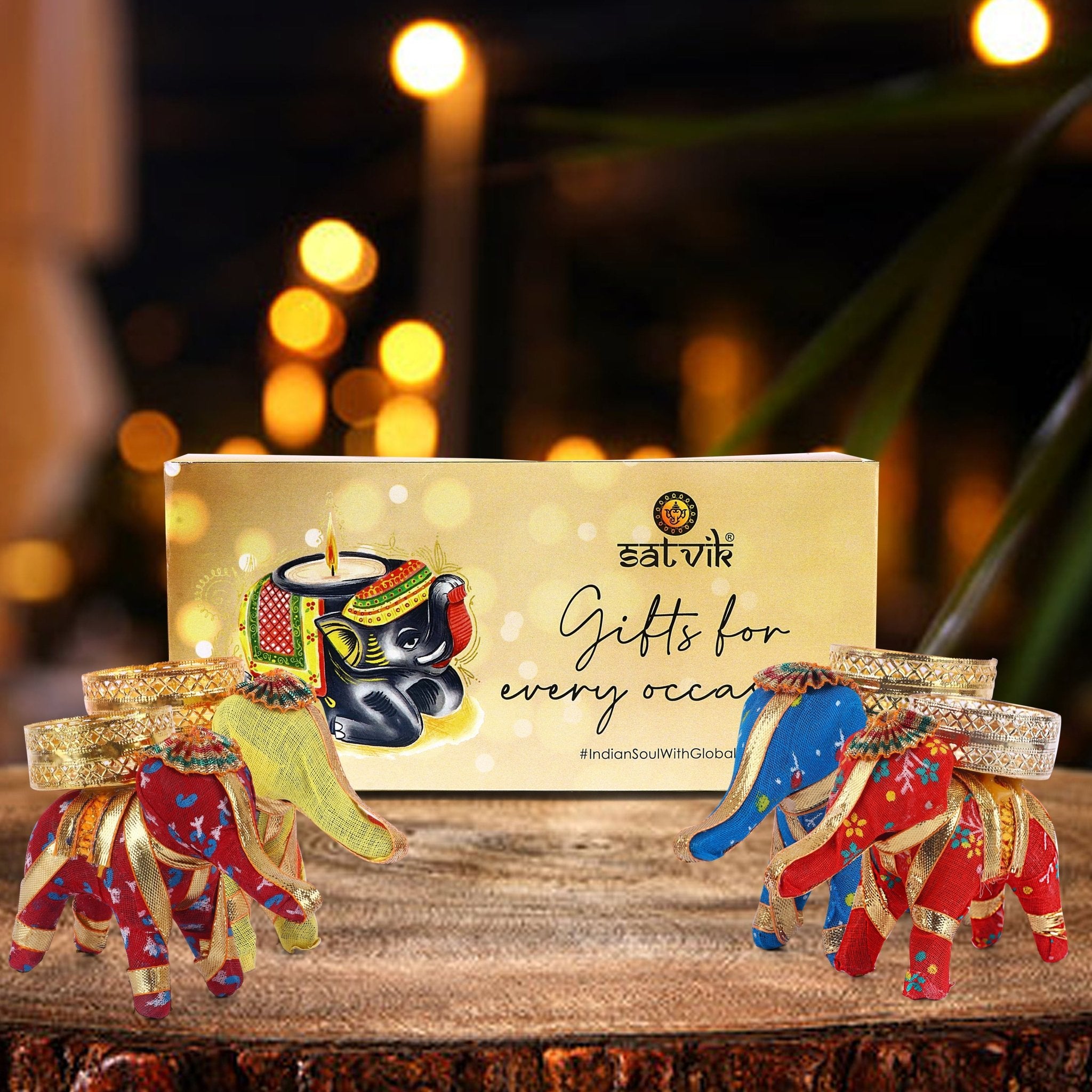 • Description:  Satvik Presents Eye-Catching Handcrafted Elephant Tea Light Holder for mandir, all pooja places and events. Tea Light Holder's are an essential part of Diwali decoration, Home and all kind of Puja's and decorations.