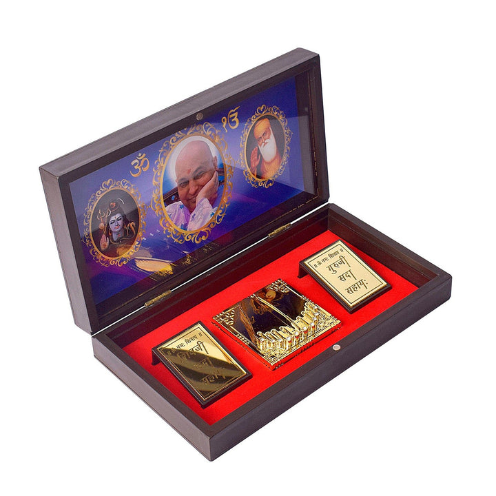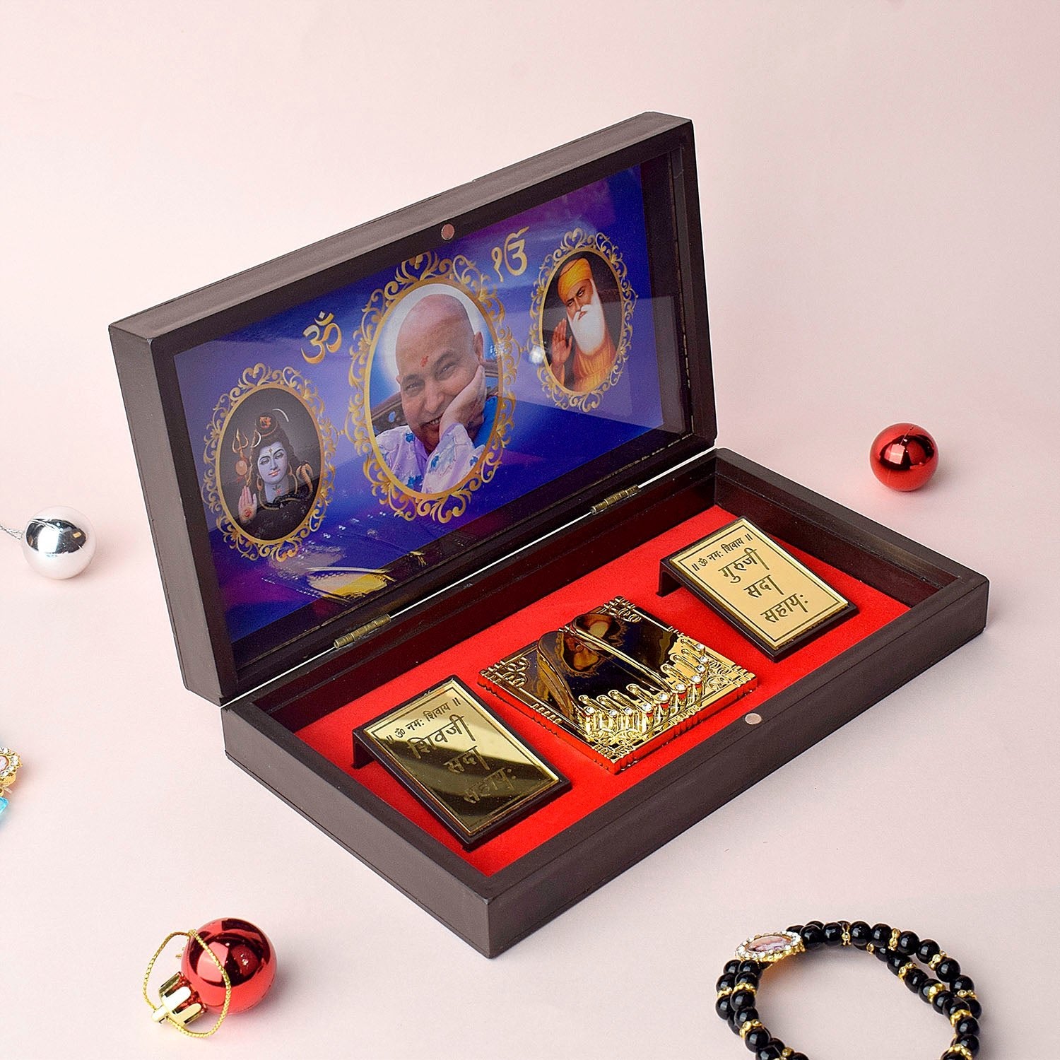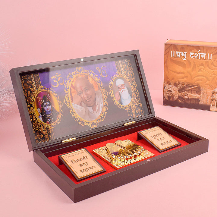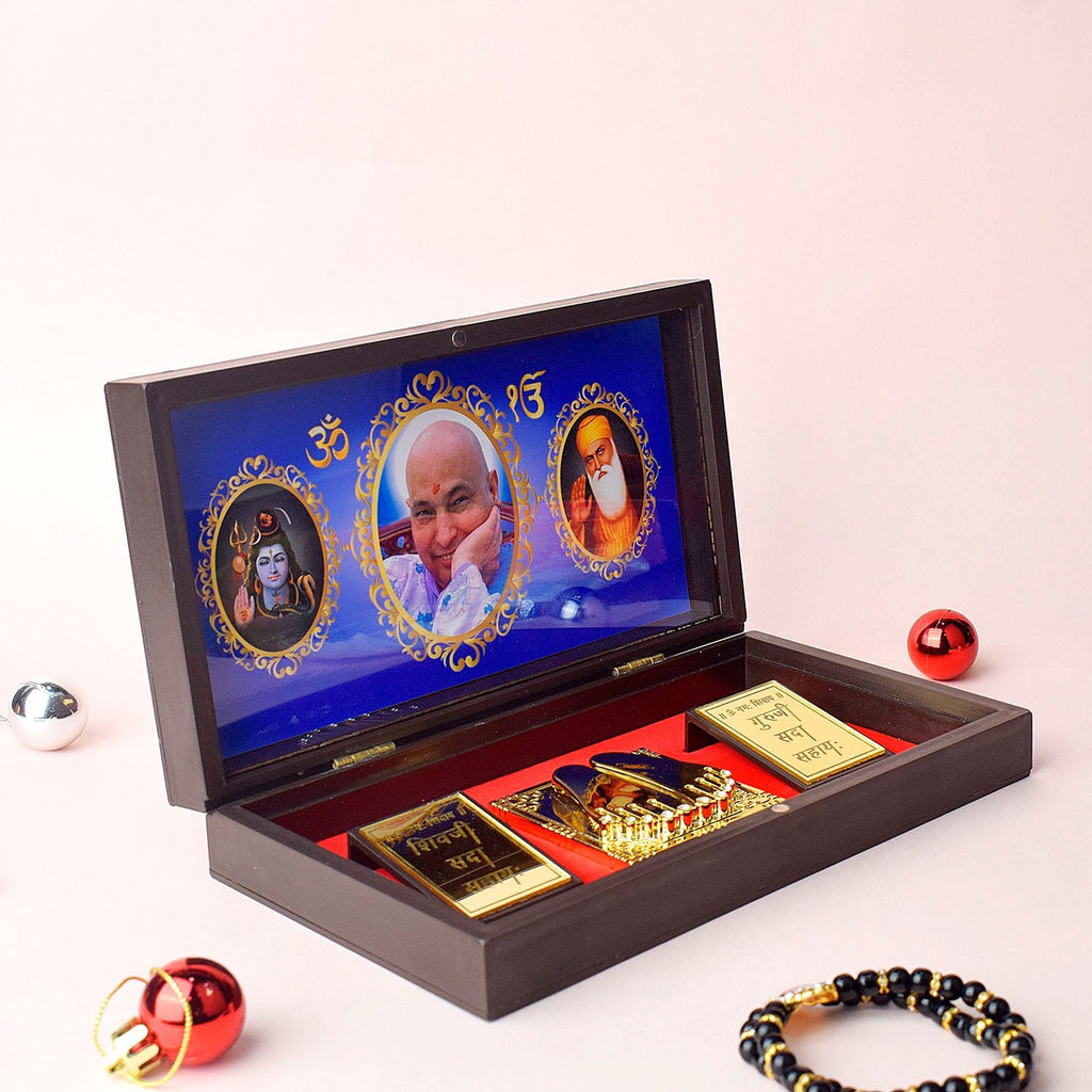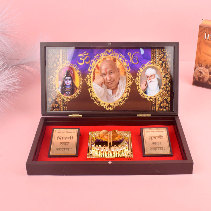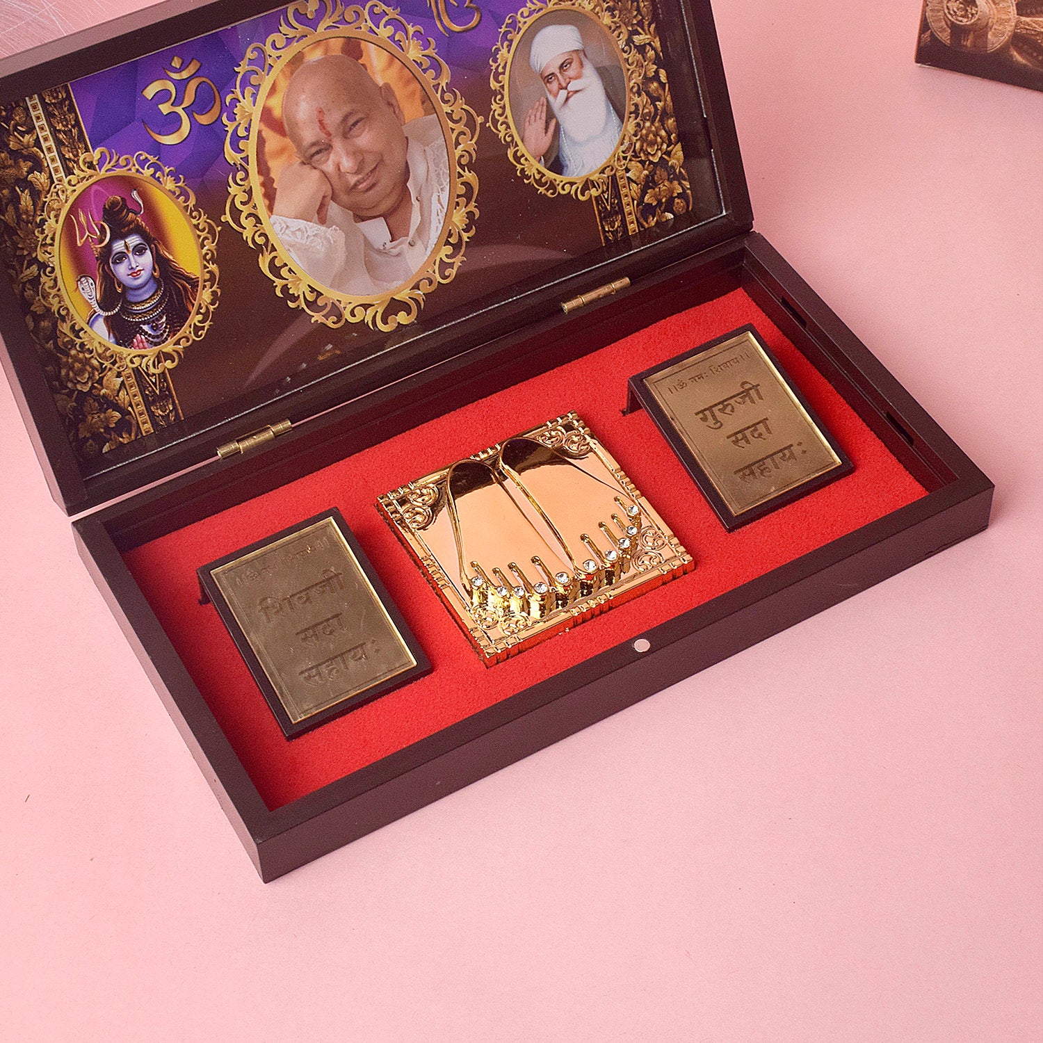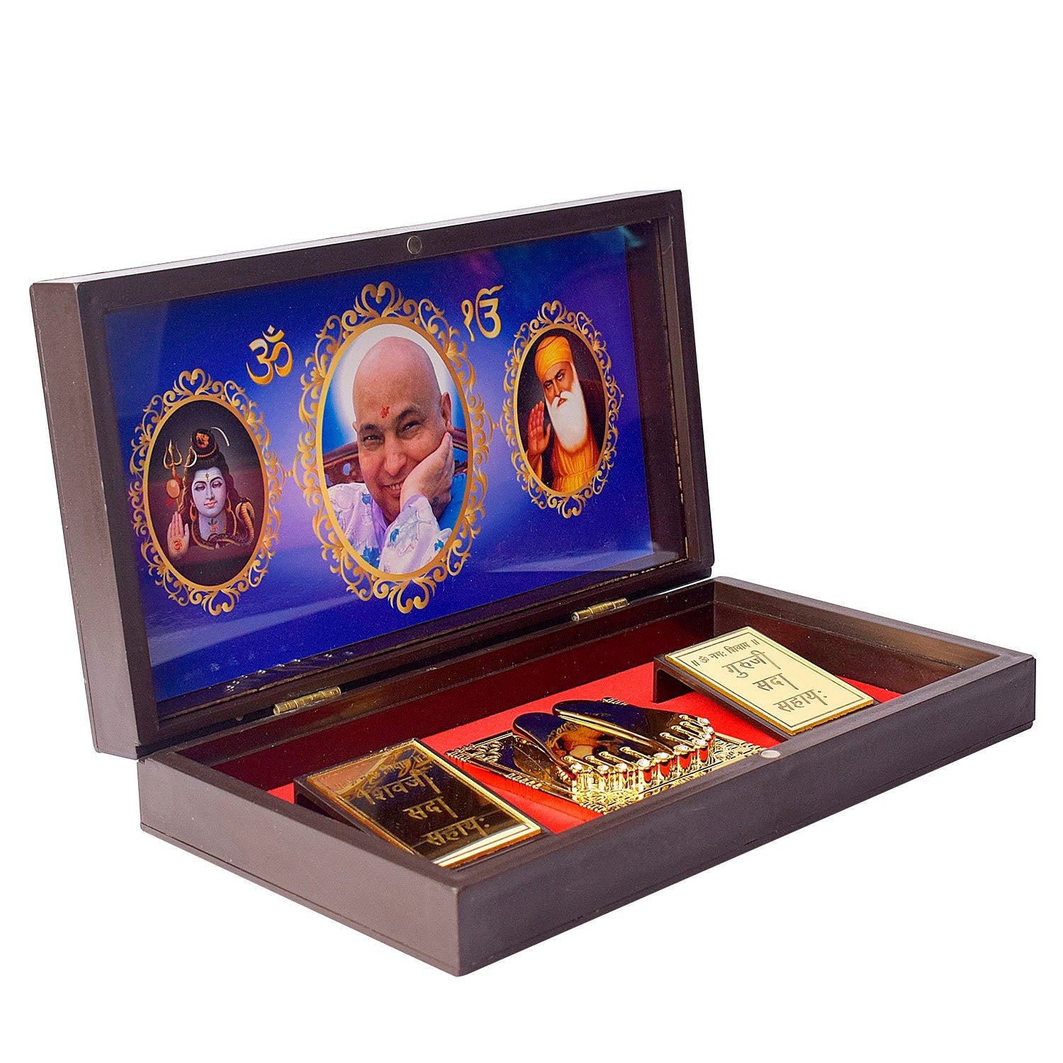 About Product:  This box has a Gold Plated Charan paduka in the middle both sides of the paduka are engraved "Guruji Sada Sahay" and "Shiv ji Sada Sahay" in a beautiful golden plated plate. It Consist of Guruji Swaroop with Shivji and waheguru. Guruji Signature over the top of the Box. It also called the Devotional Prayer Box. It has Beautiful Gift Packing all around the box so that this can be a perfect gifting Idea for any Religious Occasions.