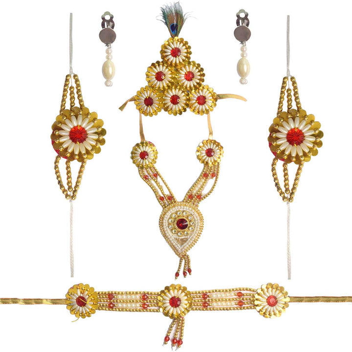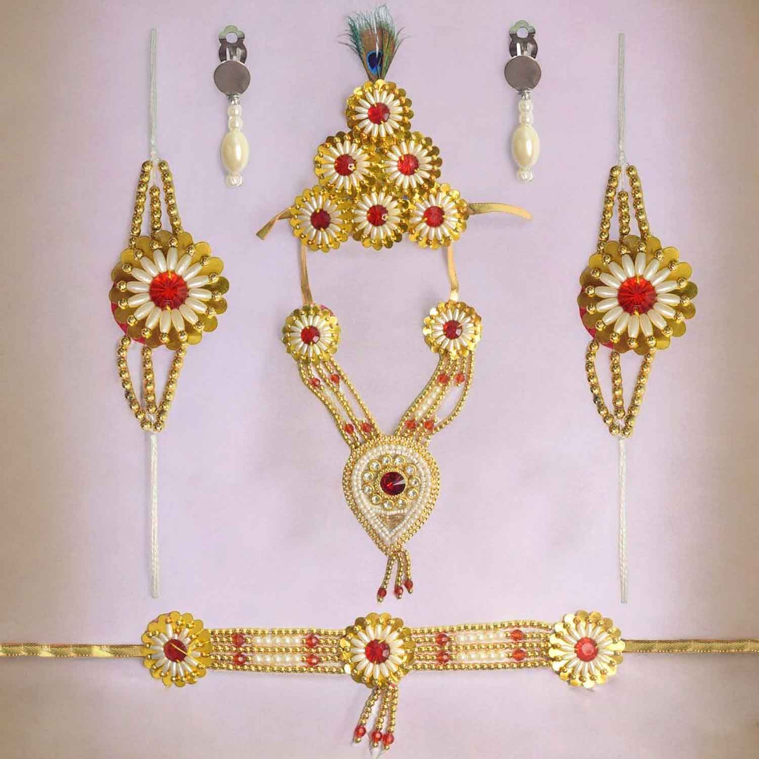 Krishna Shringhar Set | Janmashtami Accessories | Red Krishna Jewelry Set | Beaded Krishna Shringhar | Krishna Costume Accessories | Krishna Mukut Necklace Set | Gemstone Krishna Dress Set | Krishna Poshak Accessories | Traditional Kids Jewelry | Krishna Shringhar Online