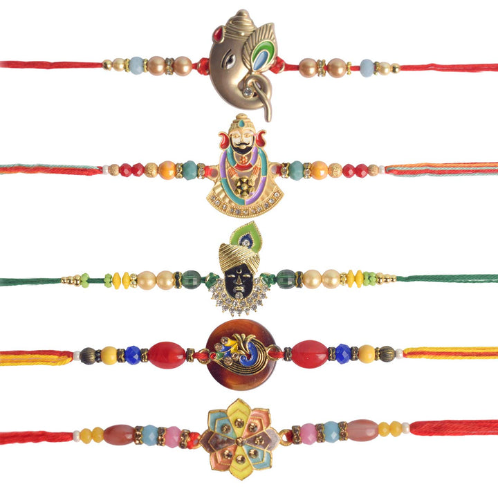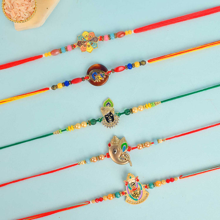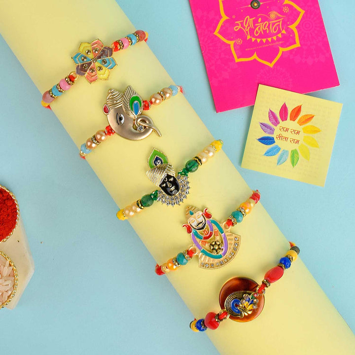Set of 5 Rakhi | Designer Rakhi Combo | Rakhi Gift Set | Rakhi with Roli Chawal | Buy Rakhi Online | Raksha Bandhan Rakhi Combo | Traditional Rakhi Set | Rakhi for Brother | Rakhi with Blessings Stickers | Family Rakhi Set