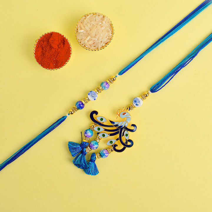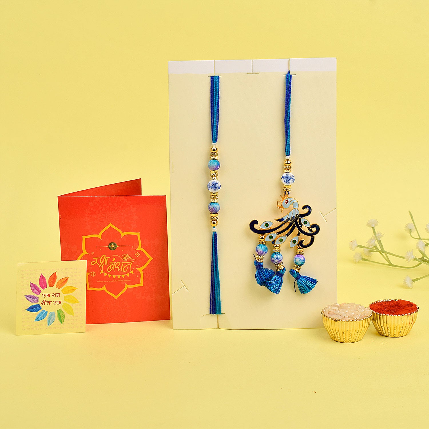 • Package: 1 Men Rakhi, 1 Women Lumba Rakhi, Roli Chawal Pack, Ram & Sita Theme Stickers