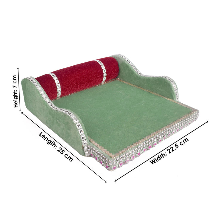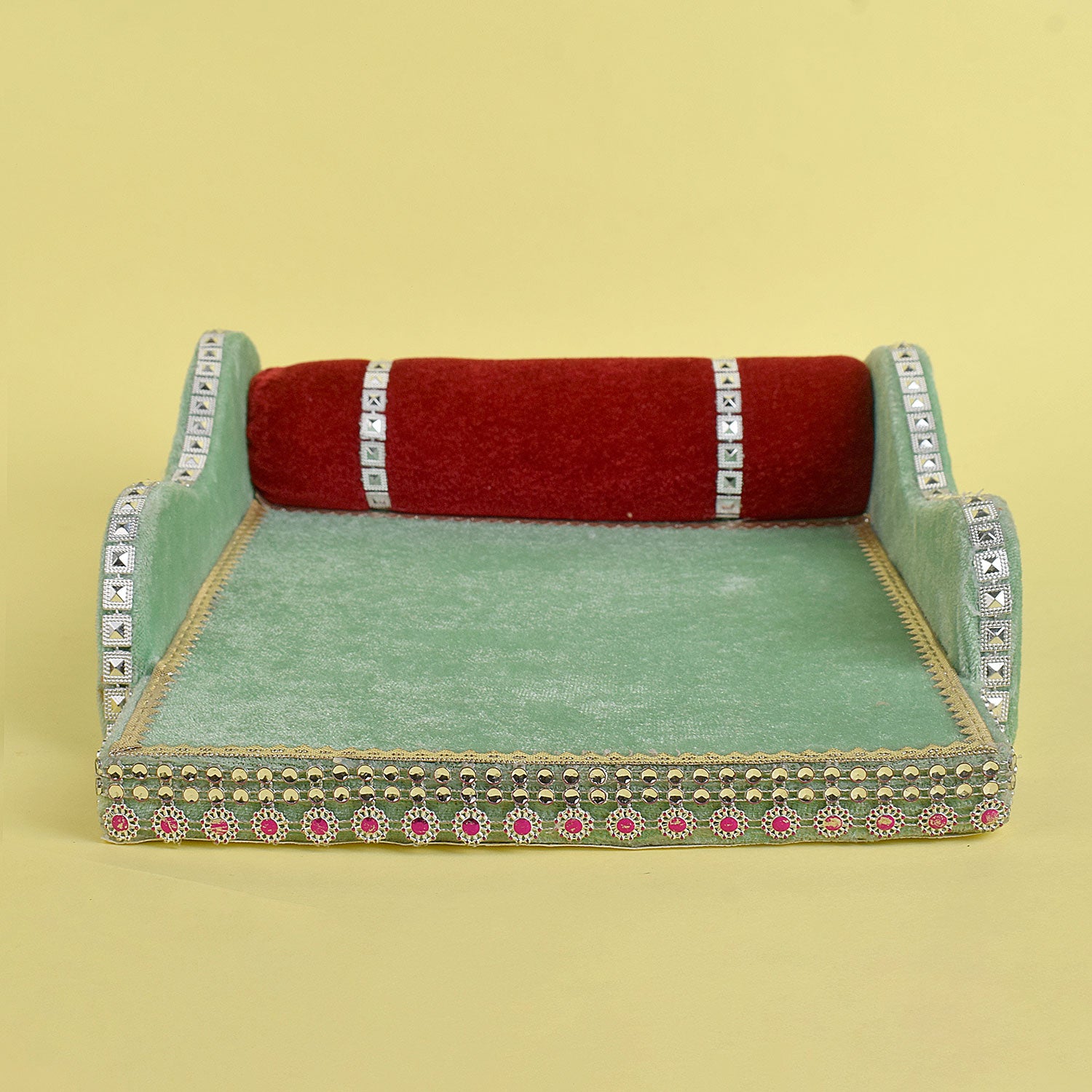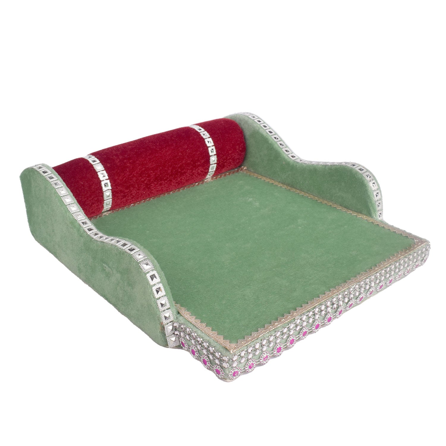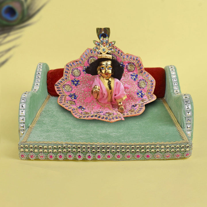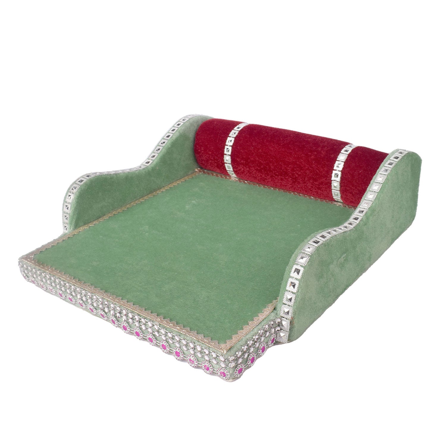 laddu gopal velvet bed | pooja bed for laddu gopal | green velvet krishna bed | pink bal gopal bed | large laddu gopal sleeping bed | devotional krishna furniture | handmade pooja accessories | velvet sleeping seat for deity | kanha ji luxury bedding | krishna temple bed