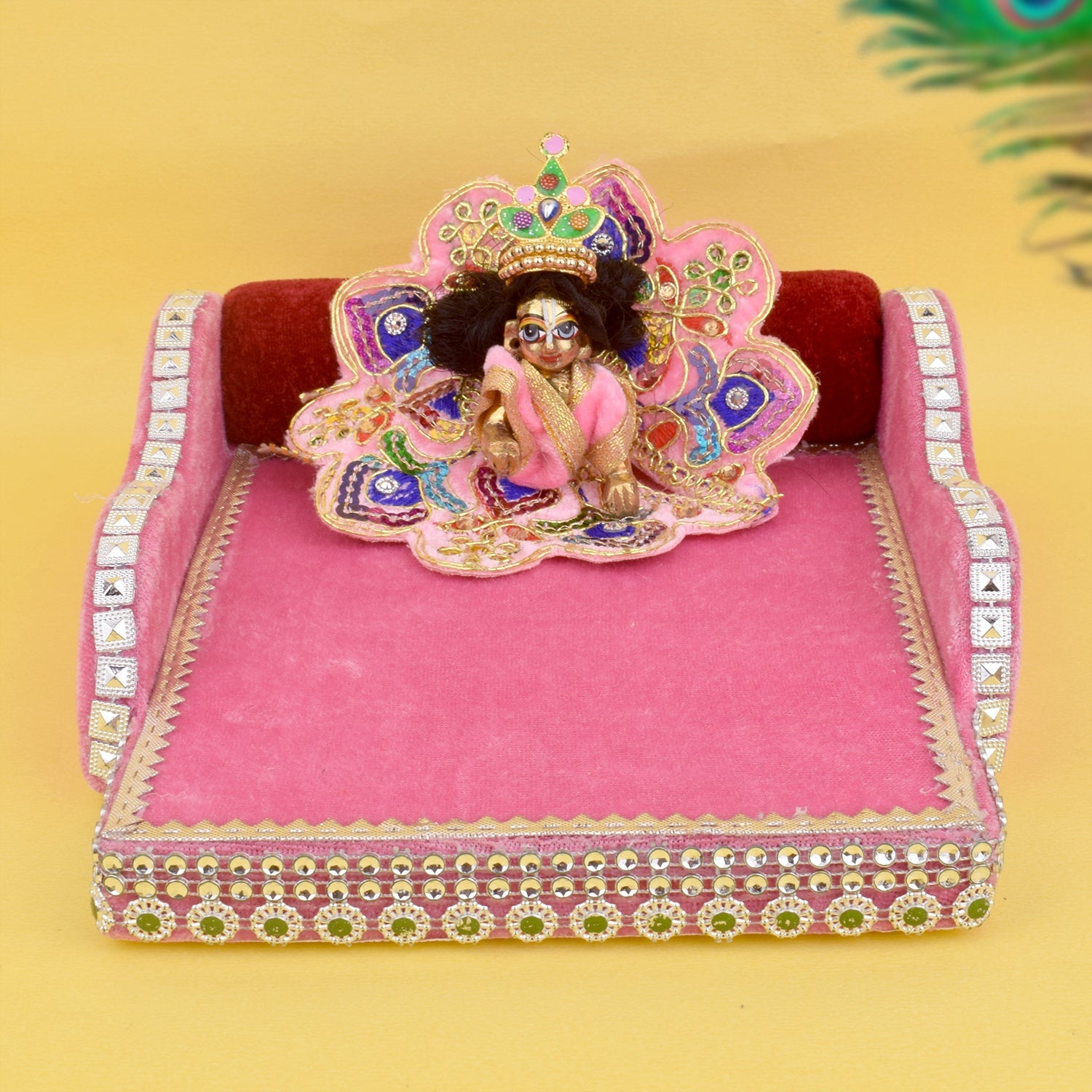 As you place your Laddu Gopal on this sacred throne, watch as the velvet embraces the little lord, showering blessings and grace upon your home. Its charming allure and captivating design make it a true centerpiece of devotion, adding a touch of splendor to your worship space.
